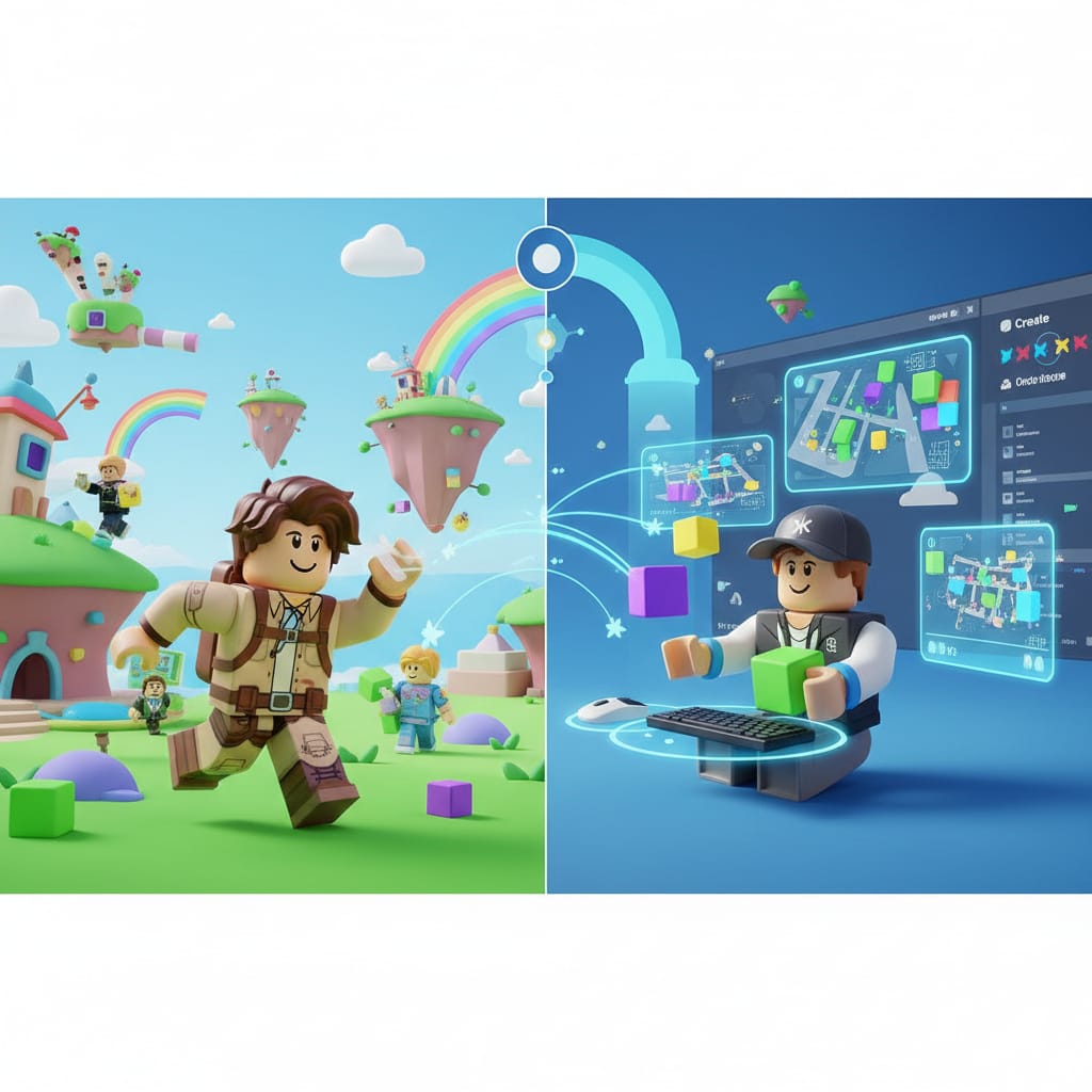 Roblox es una plataforma única porque ofrece dos formas principales de participación: jugar y crear. Aunque ambas actividades se desarrollan dentro del mismo entorno, cada